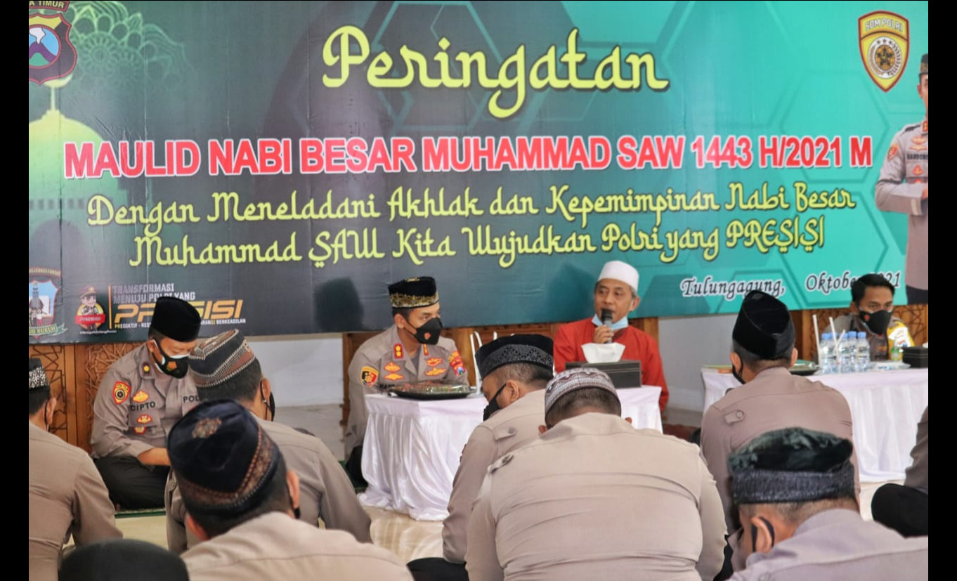 Kapolres Tulungagung AKBP Handono dalam sambutannya mengatakan, Peringatan Maulid Nabi Muhammad SAW dengan tema Meneladani Akhlak dan Kepemimpinan Nabi Besar Muhammad SAW kita wujudkan Polri yang Presisi merupakan implementasi akhlak Nabi yang selalu mengutamakan kepentingan umatnya dan diharapkan kita semua dapat meneladani sikap serta perilaku hidup Rasulullah yang dikenal sebagai sosok teladan dalam iman, Ihsan dan akhlak yang mulia.