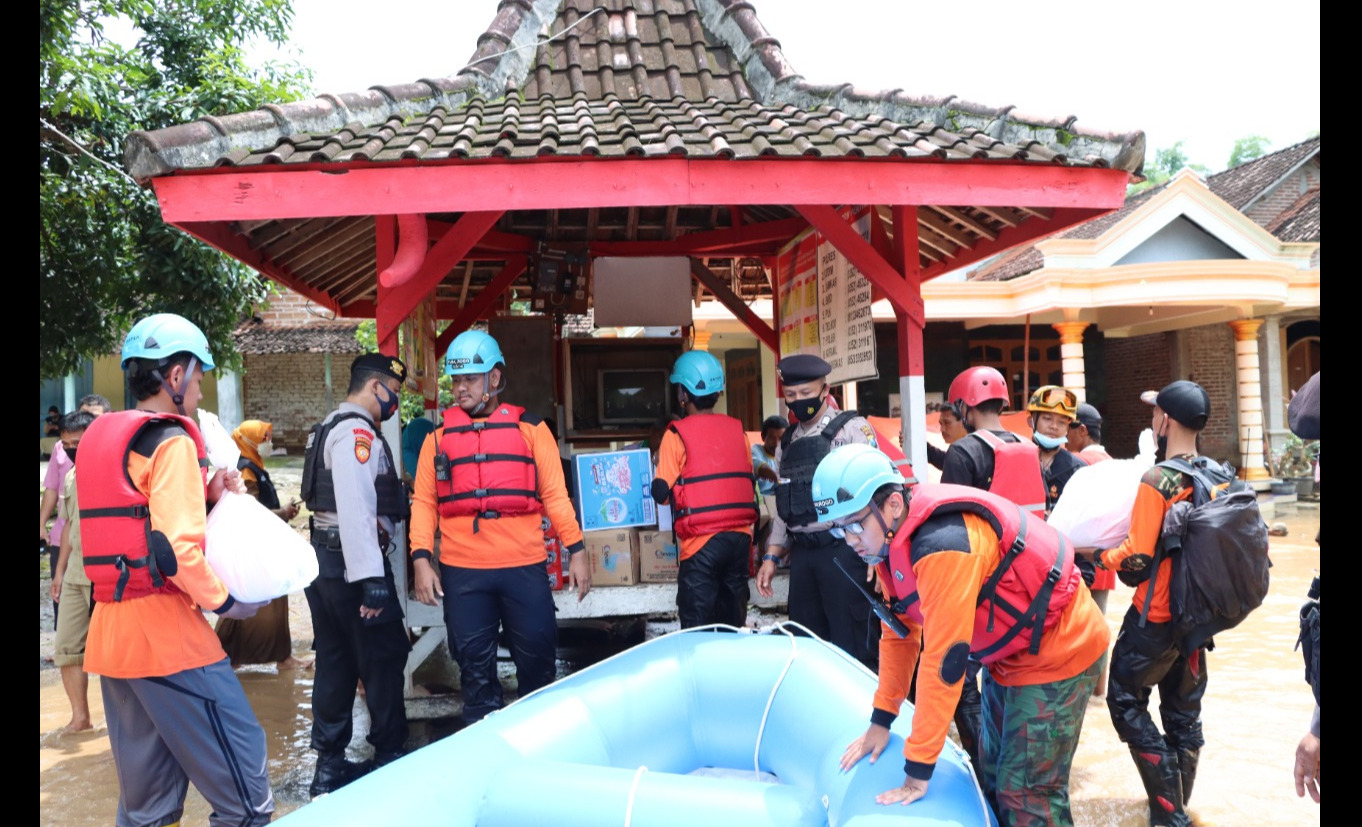 Polres Ponorogo menerjunkan Puluhan personil yang bergabung dengan inkait lainnya untuk membantu korban banjir dalam proses evakuasi dan penyaluaran bantuan makanan dan air minum. (**)