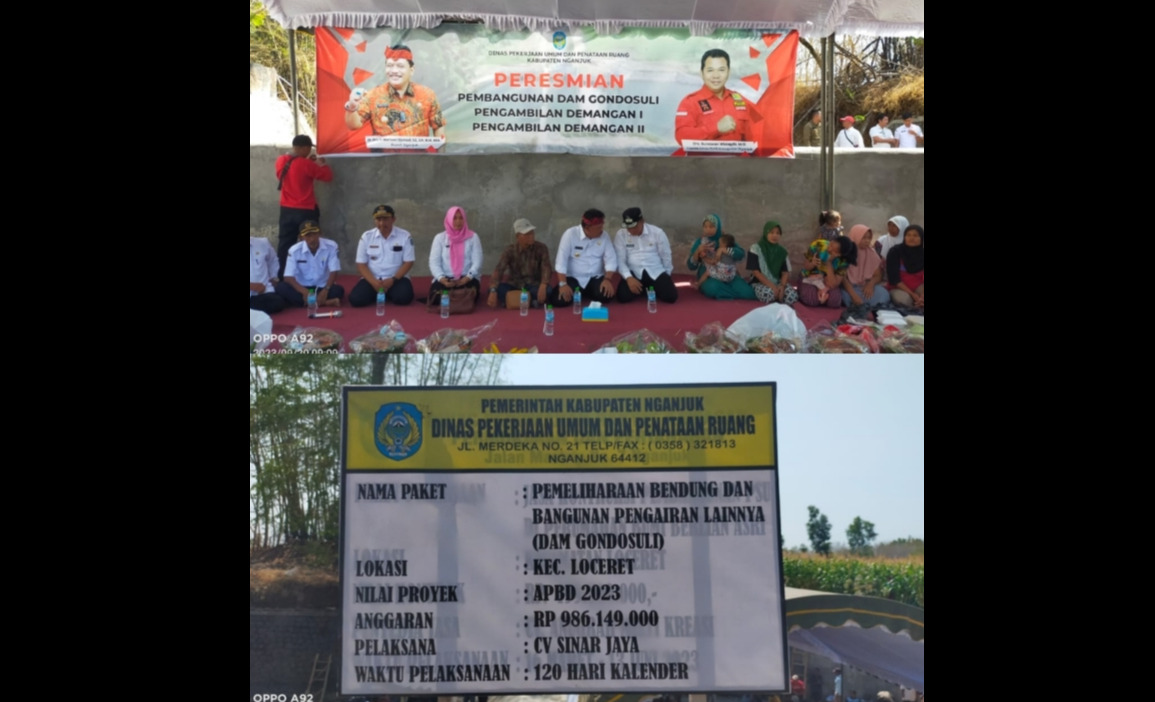 Bupati Nganjuk Marhaen Djumadi bersama Kepala Dinas PUPR Gunawan Widagdo meresmikan Dam Gondosuli di Desa Karangsono Kecamatan Loceret Rabu 20 September 2023