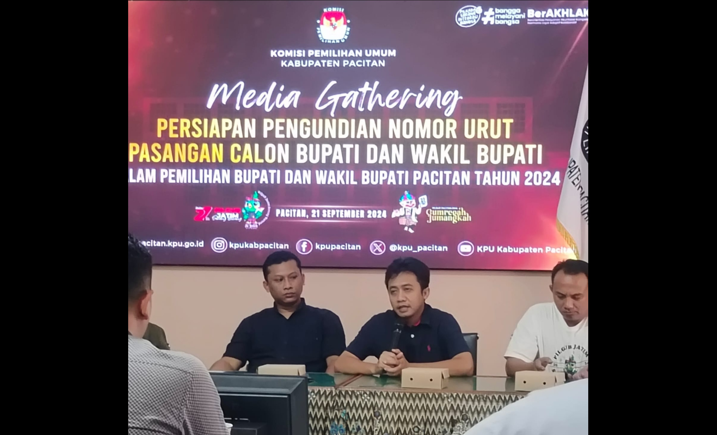 Sementara itu di kesempatan yang sama, Divisi Teknis Penyelenggara KPU Pacitan, Agus Susanto menambahkan, terkait pelaksanaan pengundian nomor urut pasangan calon bupati dan wakil bupati, akan dilaksanakan di Gedung Ghasibu Swadaya pada 23 September 2024 pukul 19.30 WIB.