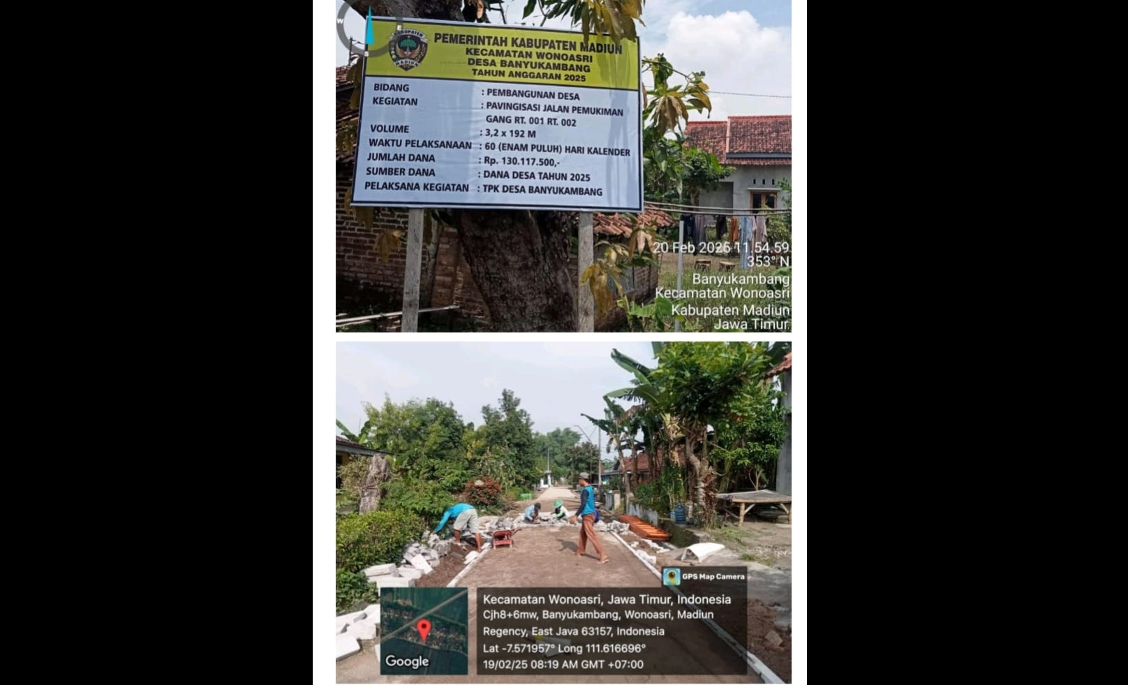 Pemerintah Desa Banyukambang Kecamatan Wonoasri Kabupaten Madiun dengan anggaran Dana Desa Tahun 2025 mengadakan pengerjaan Pemasangan Paving Jalan pemukiman bertujuan untuk membuka Akses dan meningkatkan kesejahteraan masyarakat Dusun Banyukambang 1 Gang RT 001 RW 002 Desa Banyukambang telah selesai proyek pemasangan paving block dengan tujuan meningkatkan aksesibilitas dan kesejahteraan masyarakat setempat.