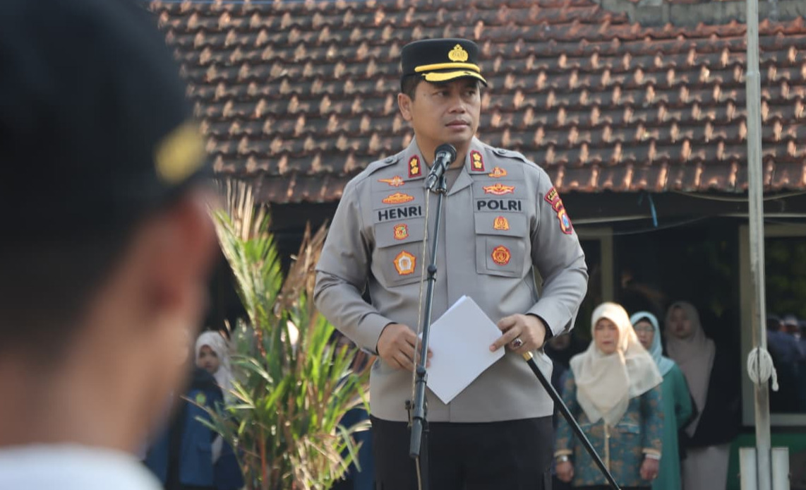 Kapolres Nganjuk AKBP Henri Noveri Santoso, S.H., S.I.K., M.M., menjadi pembina upacara di SMKN 1 Nganjuk, Senin (1/9/2025). Kegiatan ini juga dilakukan secara serentak oleh jajaran Polsek Polres Nganjuk di SMP dan SMA di wilayah hukum masing-masing.