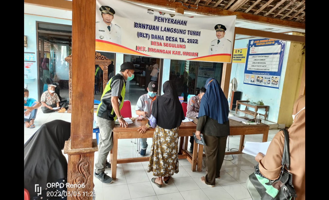Pembagian BLT - DD Desa Segulung Kecamatan Dagangan Kabupaten Madiun dilaksanakan pada hari Kamis tanggal 28 April 2022 , Tempat penyerahan BLT - DD tersebut di Pendopo Kantor Desa Segulung bekerja sama dengan Bank Jatim Cabang Madiun .